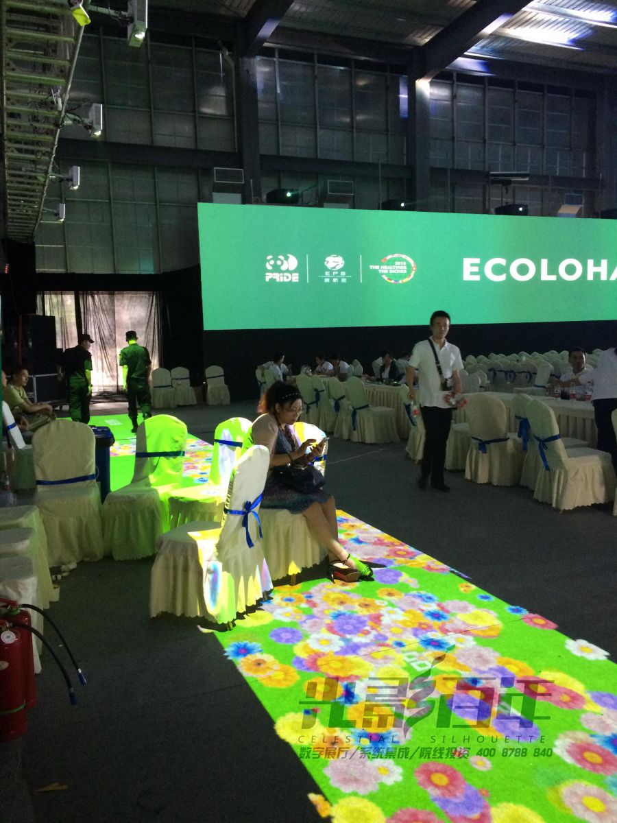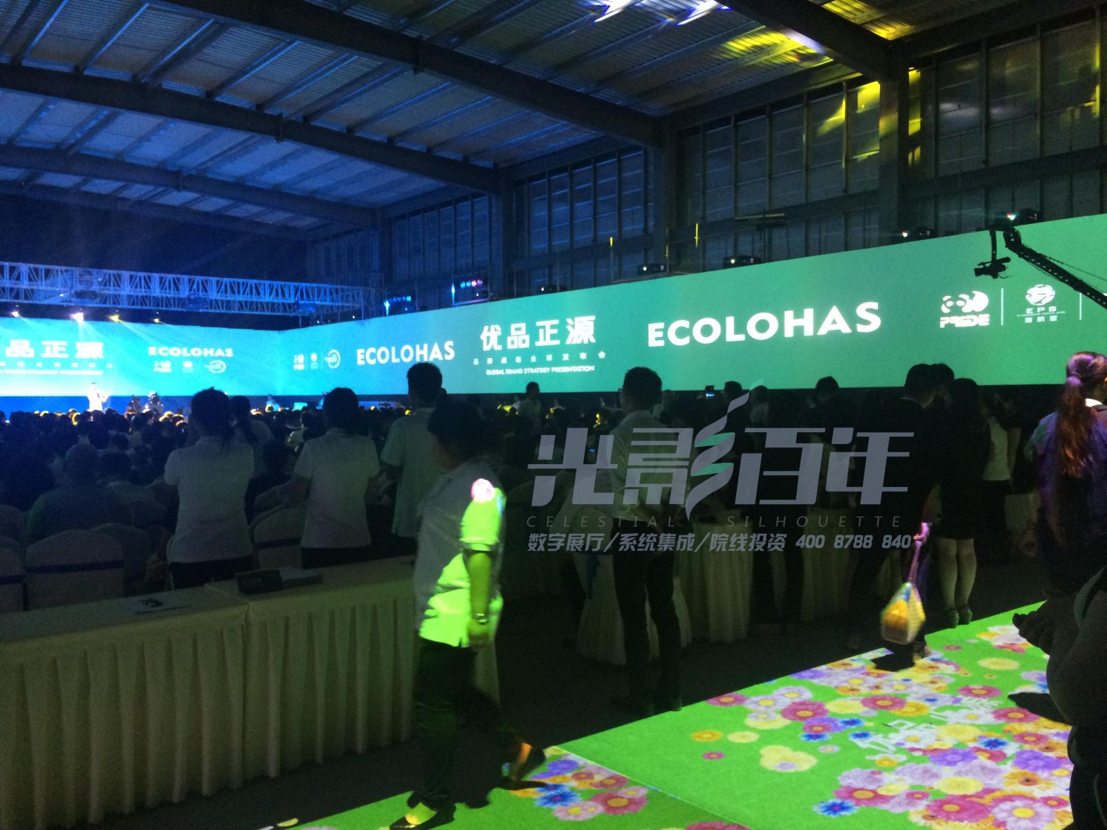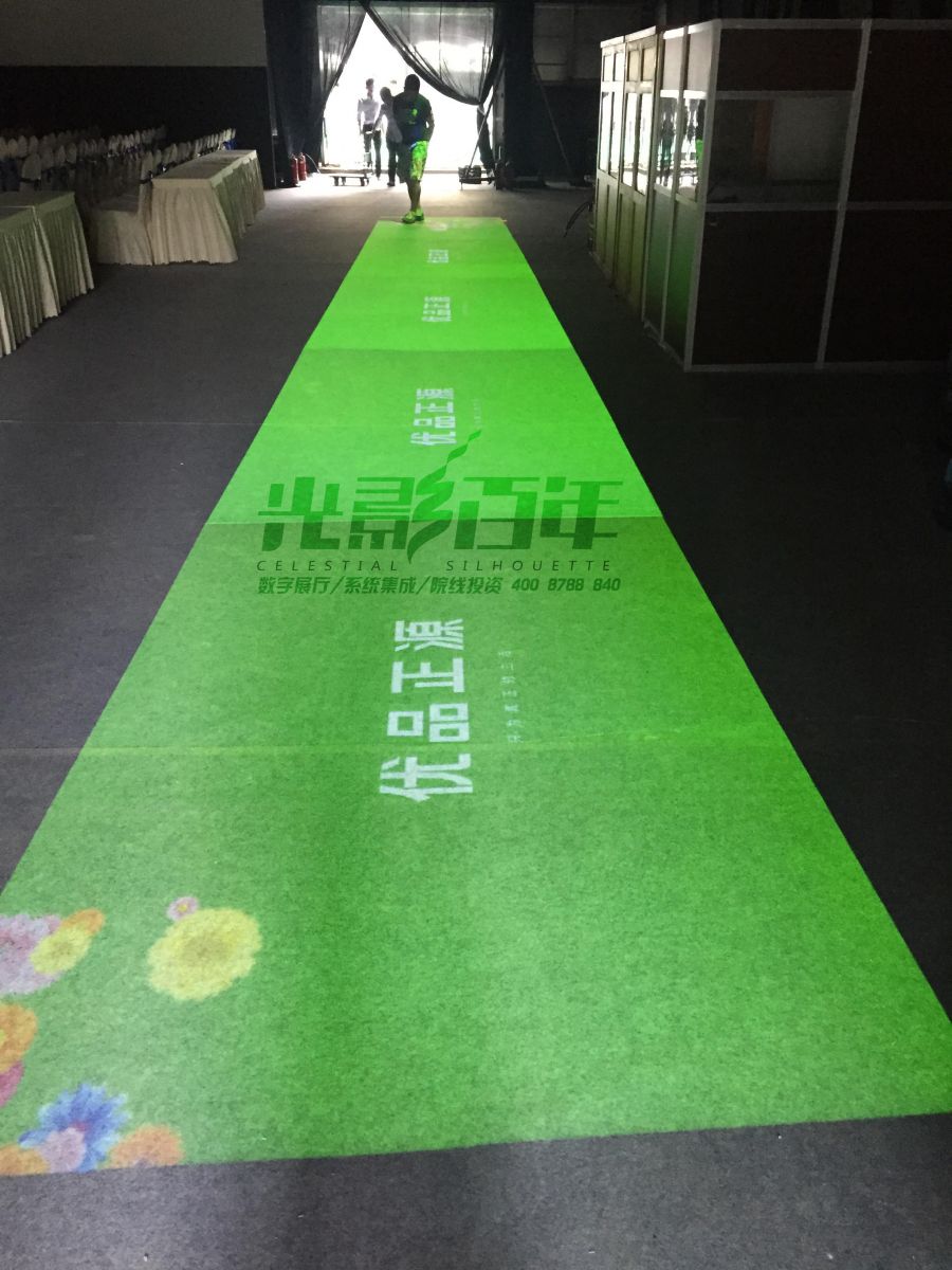 地面互動投影融合系統總長18米,是發布會的互動迎賓通道。根據優品正源綠色健康的產品理念,光影百年將通道主色調設置為綠色,意為貼合自然,食補養生。繁花盛開的絢爛光影效果,則意味著所有來賓將與嬌子意航星共赴繁花似錦的美好未來。