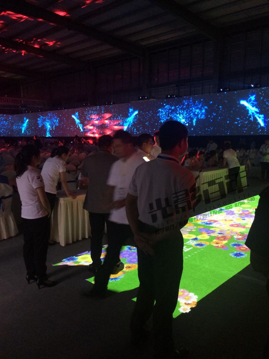 在此次發布會中,光影百年主要做了兩個應用,一個是大屏投影融合系統(即大屏幕以及兩邊墻面屏幕展示),一個是地面互動投影融合系統(即來賓通道的地面光影效果展示)。
