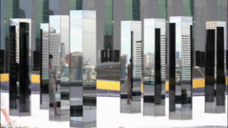 在泰國曼谷市中心暹羅天地有一件鏡面燈光互動裝置,50個燈柱排布在廣場中,外表是高清的單面玻璃鏡,內部則是聲感LED燈;白天的時候50面燈柱組合成一個鏡面迷宮,進入的游客能看到無數個反射的自己,稍不留神可能會迷失,到了晚上50個燈柱則會根據游客的腳步聲和廣場的音樂點亮燈柱,做出一系列的反應,有規律的進行燈光脈沖,形成美麗的燈光波浪,讓游客沉浸其中。