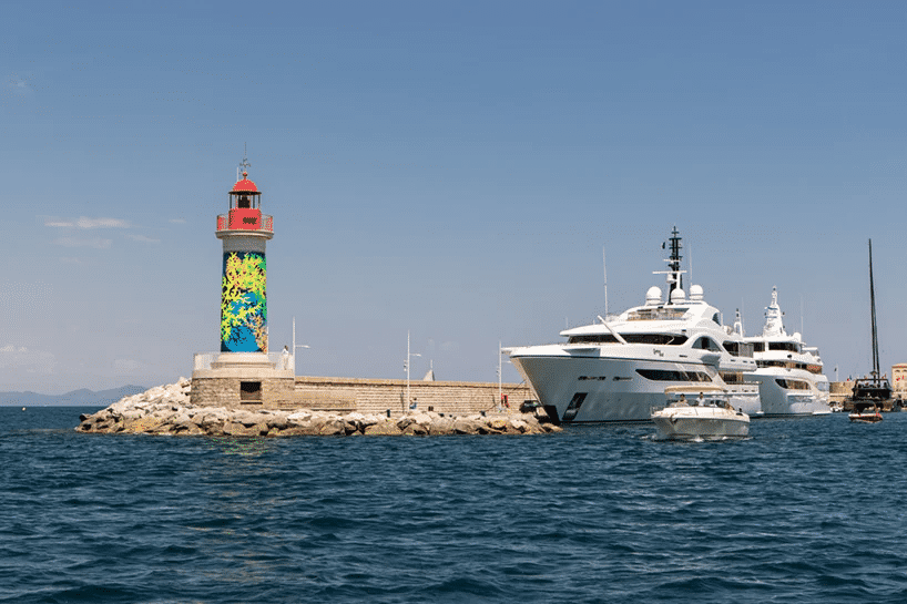 珊瑚作為深海中一道亮麗的風景線,不僅是重要的海洋生態系統,也對海洋生態起到重要作用,而Coraux Fractal 1 藝術裝置則是將深海處的珊瑚群帶到了圣特羅佩燈身上,整個塔身用熒光染料包裹住,到了夜晚用紫外霓虹燈照亮熒光染料喚醒刪除群,這不是簡單的投射,原理和海洋深處發光的生物類似,生物發光是生物體產生和發射光,深藍色的背景下,巨大的珊瑚枝重疊在一起,讓人沉浸式其中就好像真的在深海觀看珊瑚一樣。