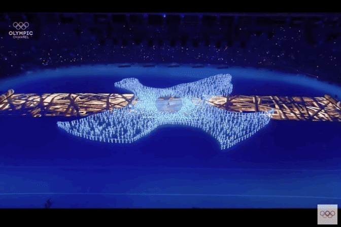 下篇《輝煌時代》,這是我們對未來的憧憬,一只由上千人組成的熒光和平鴿緩緩扇動翅膀,代表著我們對世界和平的期許,航天員在鳥巢上空飛過,劉歡和莎拉·布萊曼演唱奧運會主題曲《我和你》,當姚明帶領中國代表團進場那一刻,全場沸騰,李寧腳踏祥云飛天點燃主火炬,更是成為了奧運歷史的一個永恒瞬間,那一刻無數人熱淚盈眶。