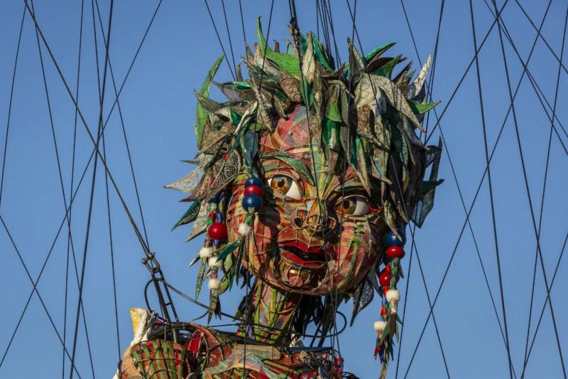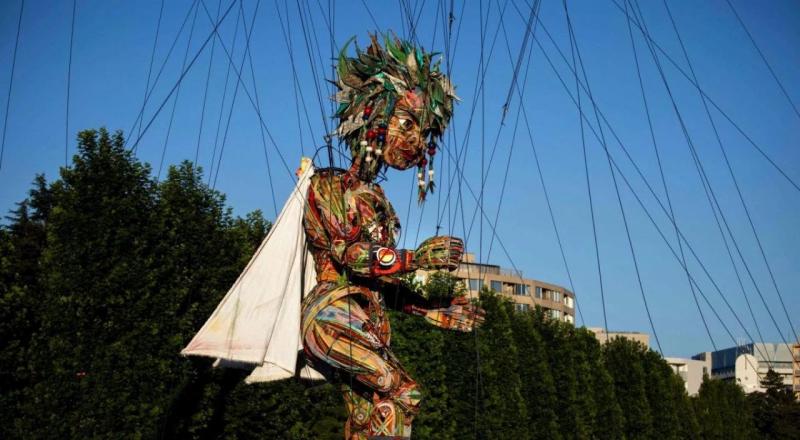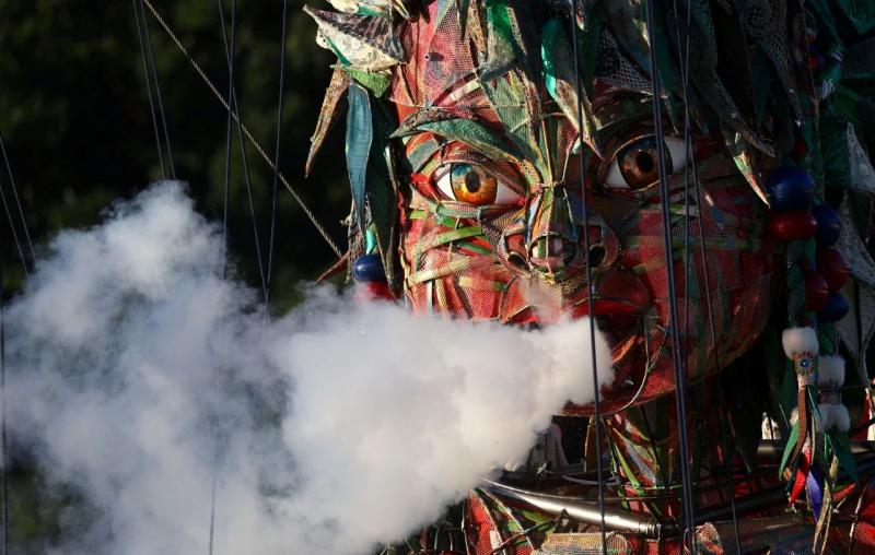 東京奧運會藝術展覽“搬運幸福之旅”在新宿開展。藝術家箭內道彥設計的木偶“MOCCO”是以日本三縣災區小朋友的繪畫為原型,使用竹子等材料制成。高10米、重1噸的“MOCCO”形同小巨人,在數十位工人配合機械的牽線操作下,他可以行走、轉動眼珠,嘴中還可以吐出霧氣。