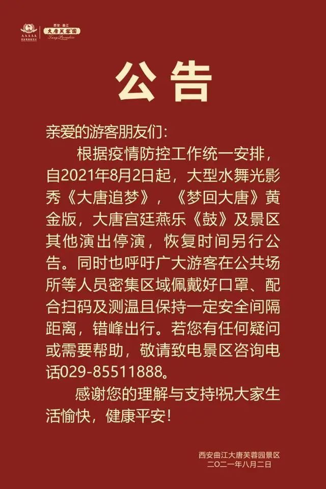 八月一號、二號,西安多個景區發布公告,暫停相關演出,景區游玩等項目其中就包括大家熟悉的大唐不夜城、大唐芙蓉園等。