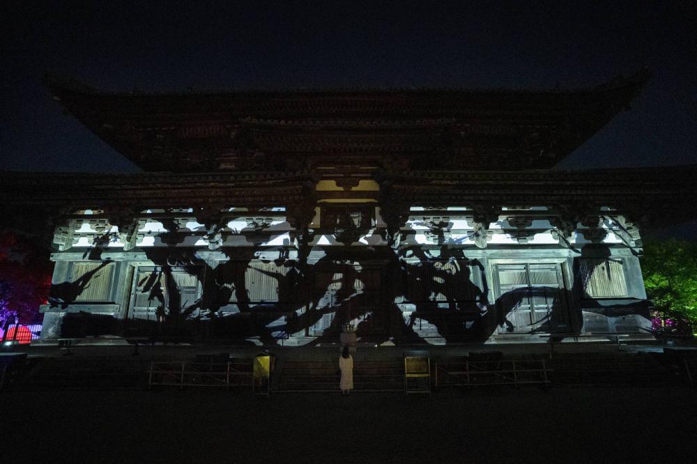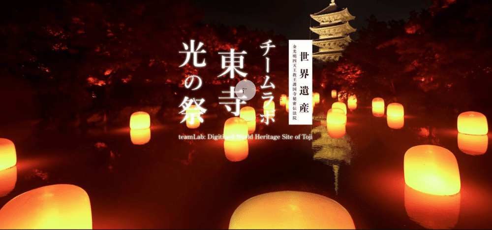 除了團隊在其他展覽中共同的作品共振森林、生命之樹和發光呼應的球體等互動裝置外,還有針對東寺特別創造的藝術作品。