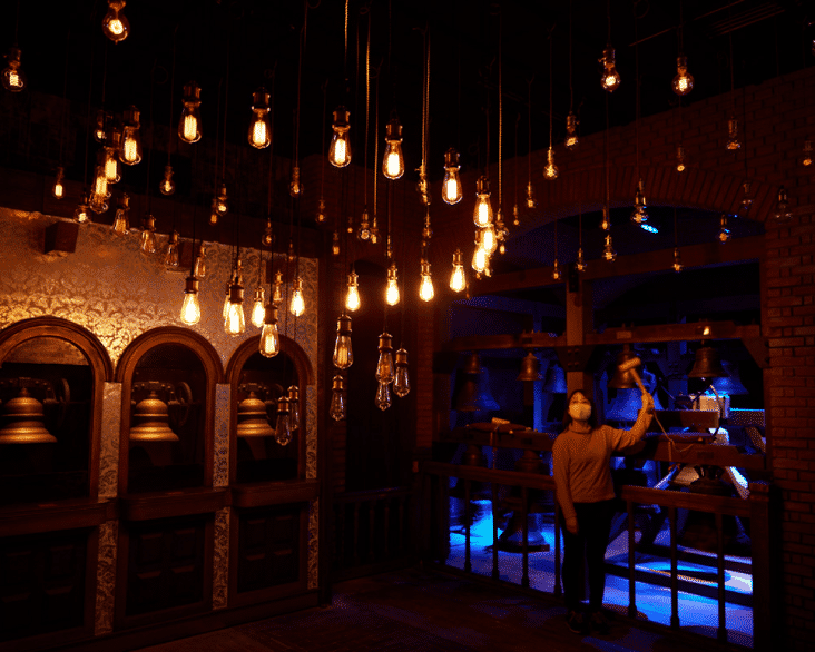 音樂燈光主題,在這里感受音樂和燈光的同步起伏,當游客敲打鈴鐺時,周圍的燈光會跟隨音樂變化,在聲樂光中共舞。