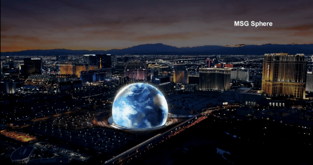 由麥迪遜廣場花園娛樂公司和拉斯維加斯金沙公司合作建造的世界上最大的球形沉浸式體驗中心“MSG Sphere”,該項目耗資約18億美元,高 112 米,擁有 17,500 個座位,所有座位都將提供高速互聯網接入,并配備世界上最大、分辨率最高的 LED 屏幕,其像素可以達到19,000 x 13,500,觀眾在150米外都可以看到清晰影像的球形娛樂場所,這也是世界上最大的由LED的外殼組成的球形建筑。