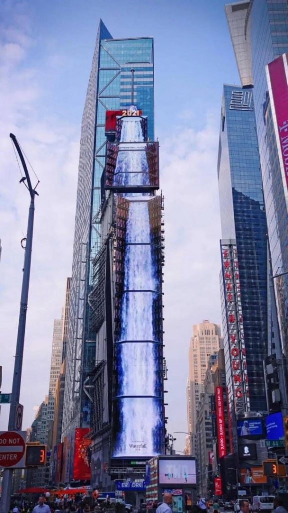 美國(guó)紐約市時(shí)代廣場(chǎng)被稱為“世界的十字路口”,這里匯聚了近40家商場(chǎng)和劇院,大量耀眼的霓虹光管廣告、以及電視式的宣傳版,高樓林立上百多塊戶外屏幕組成高樓的外壁,最近韓國(guó)的數(shù)字媒體藝術(shù)團(tuán)隊(duì)d’strict旗下的團(tuán)隊(duì)a’strict在紐約時(shí)代廣場(chǎng)帶來(lái)了最新裸眼3D作品:《Waterfall – NYC》。