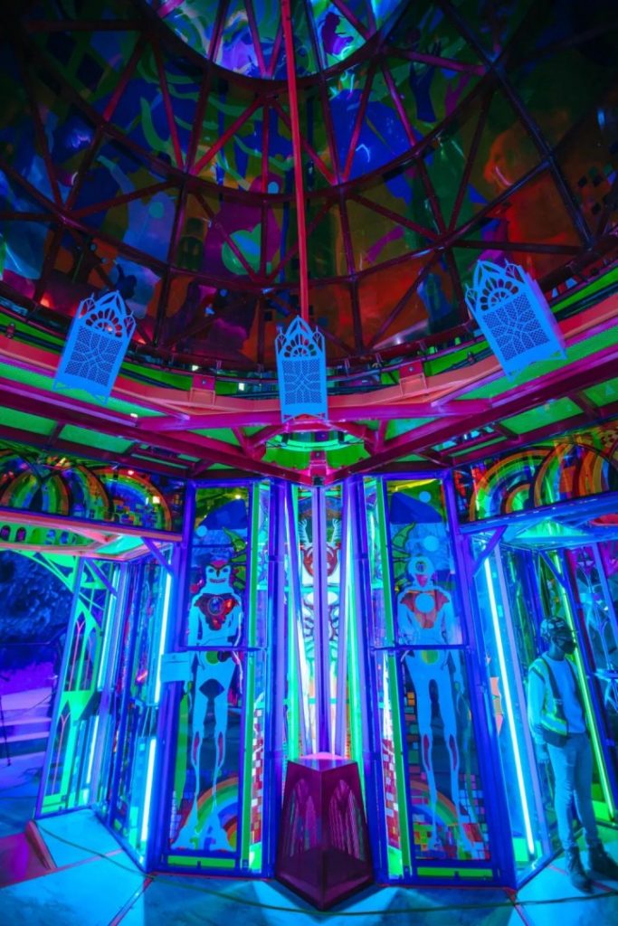 這里的一切都充滿著神圣的韻味,你看,穹頂處數(shù)字創(chuàng)意投影出的旋渦,說明“Eenia”正在努力與地球上的其他地方重新建立聯(lián)系。