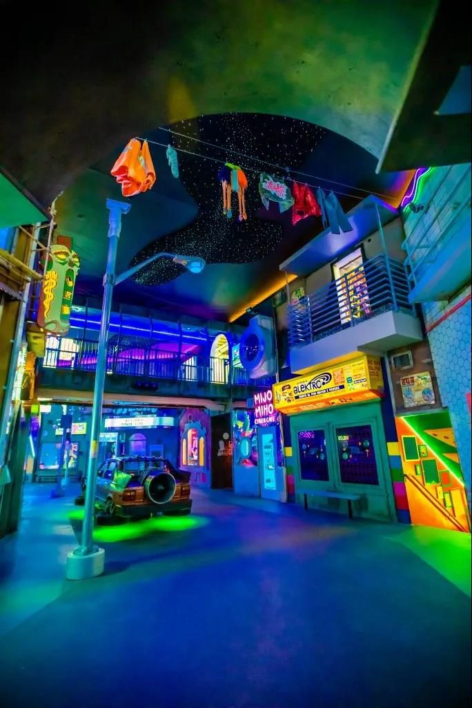復古的街道,林立的霓虹燈藝術(shù)燈光,鮮亮迷人的互動裝飾墻,喚起了一些模糊的過去和未來的記憶,讓人聯(lián)想到風格化的東京或洛杉磯。