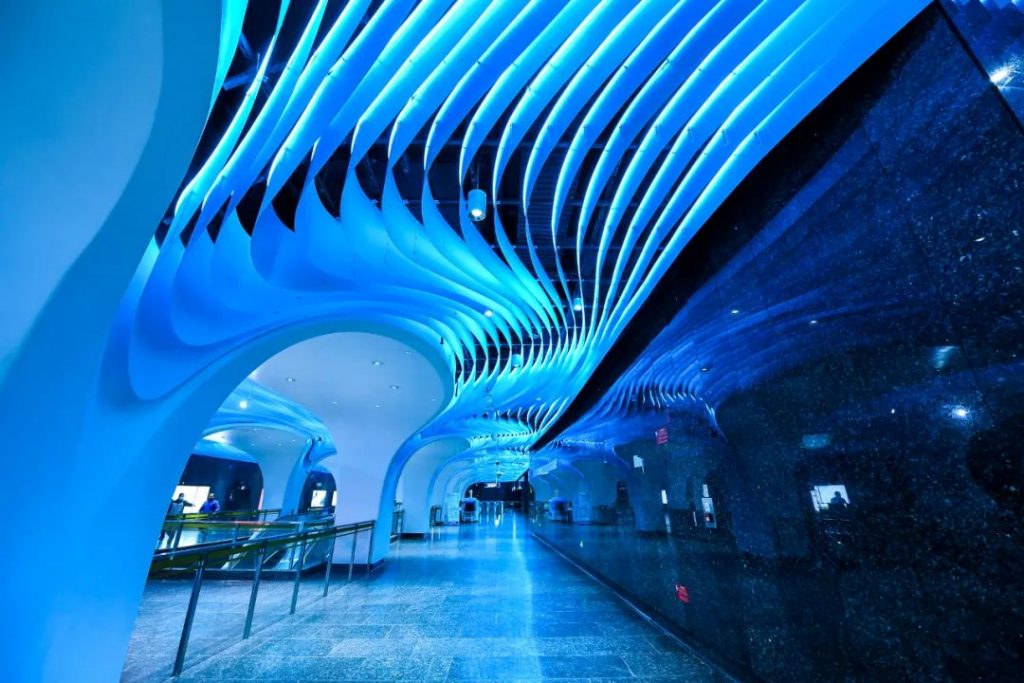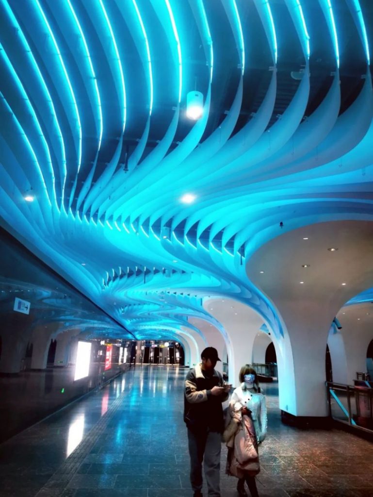 內部空間內天花的“水波”拍打到上面,形成一個個朝下的浪尖兒,而巨大的天幕本身就是一個三維LED裝置,燈光能夠根據節日或者主題需要進行實時動態變色,春節的喜慶、七夕的浪漫、中秋的團圓都能隨之變化,這個天花的內容是開放的,市民也能參與到水波天幕的創作中來,共同打造這個美麗的藝術站。