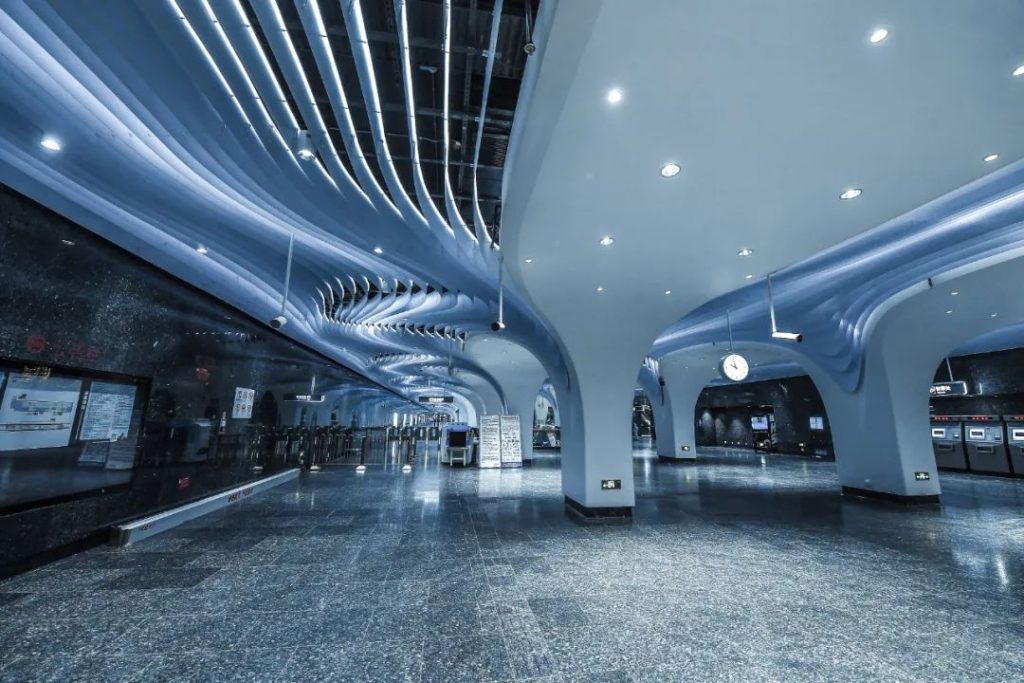 歷經三個月的設計創作,設計師基于對上海當地的文化的研究,決定以黃浦江的水流形態設計理念,把整條黃浦江搬進了這座地下深處的地鐵站,一條條曲線在天花板和柱子上延伸,光影像水流一樣在壁上流淌,以水波的形態和視覺感受呈現了海納百川的上海城市精神,一個古典、東方、現代的沉浸式體驗空間出現在人們面前。