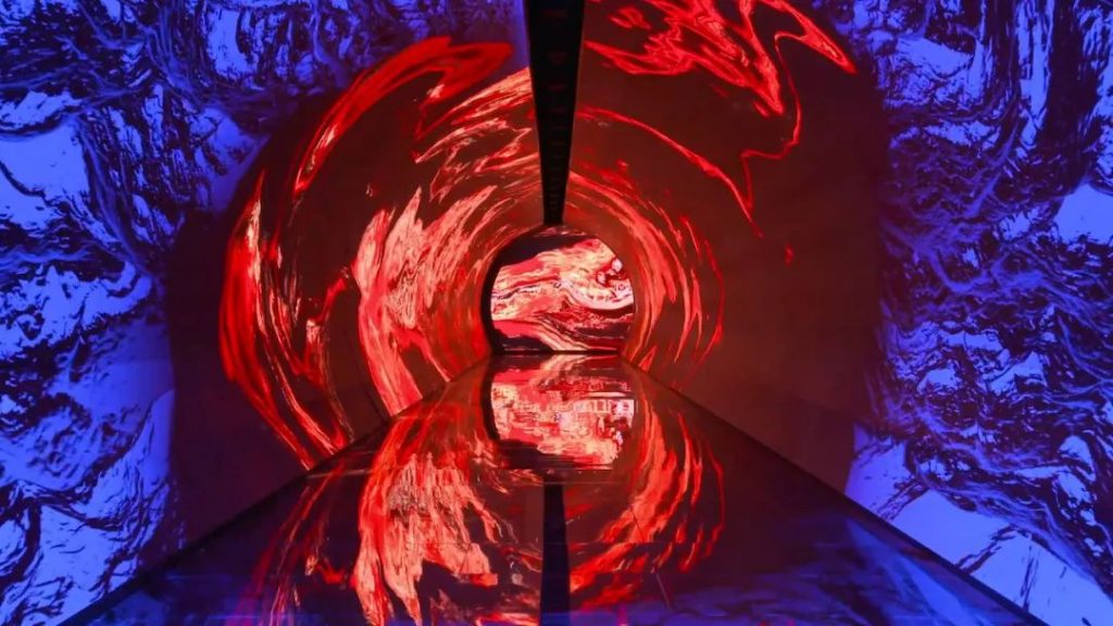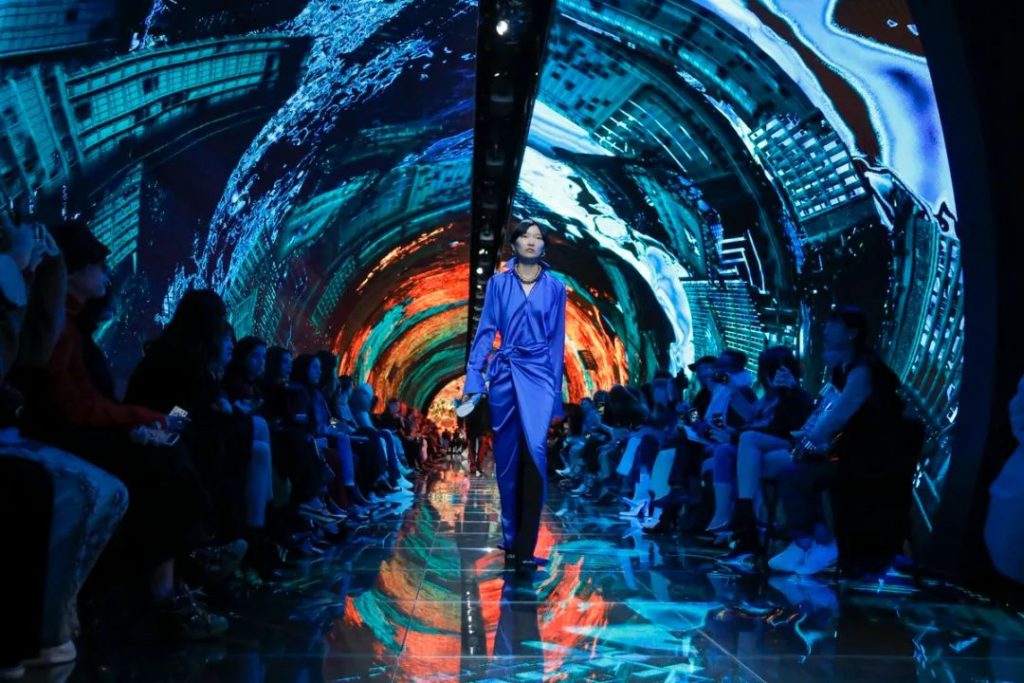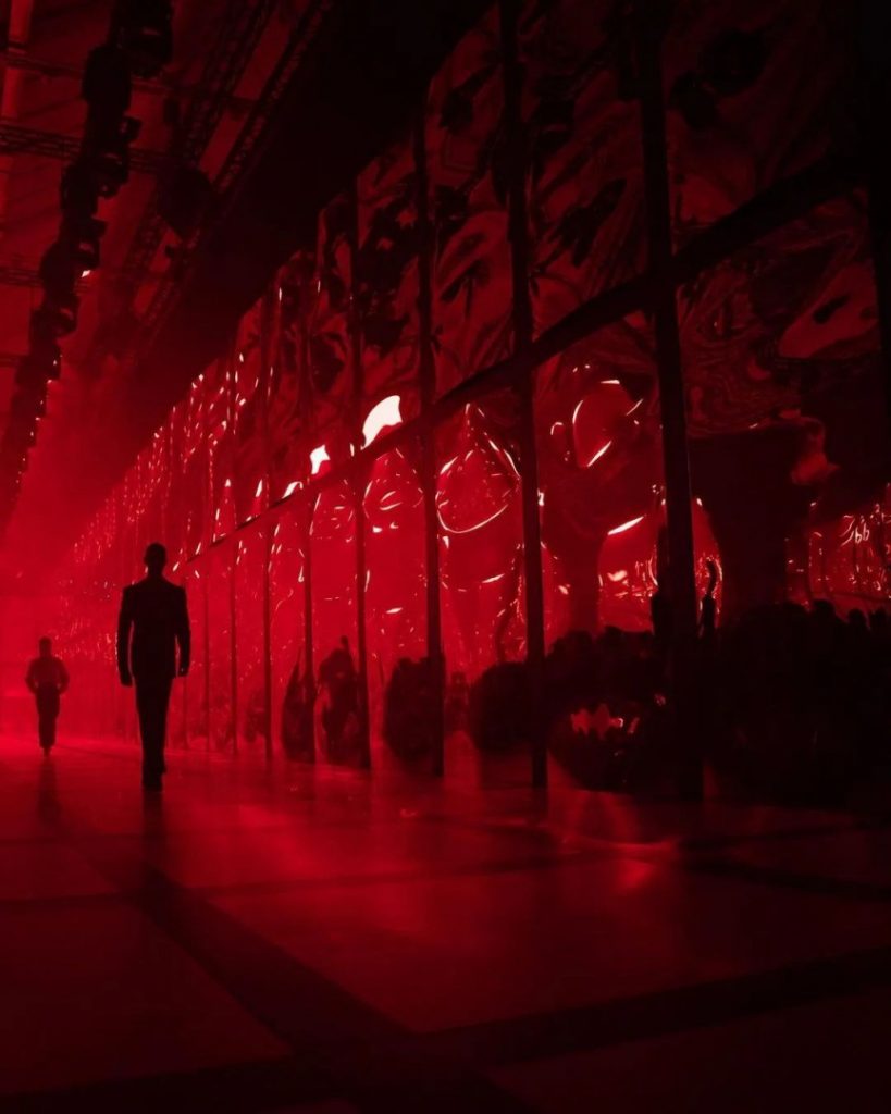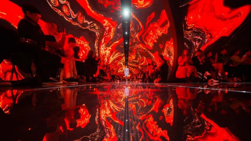 模特穿過視頻屏幕的2000平方米隧道,伴隨波浪、熔巖流動(dòng)、行星形成然后融化,色彩的沖擊產(chǎn)生了真實(shí)的烏托邦,讓觀眾沉溺于宇宙混沌之中。