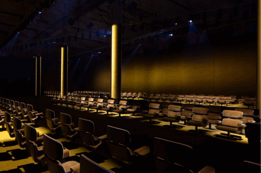 設(shè)計(jì)團(tuán)隊(duì)將秀場空間翻新后重新設(shè)想為“stage for action”,用橄欖綠色地毯覆蓋T臺(tái),并將一排排豪華的劇院座位錯(cuò)落排布。由一條霓虹燈和金屬格柵組成未來感隧道為走秀起點(diǎn),詮釋其未來主義的設(shè)計(jì)理念。