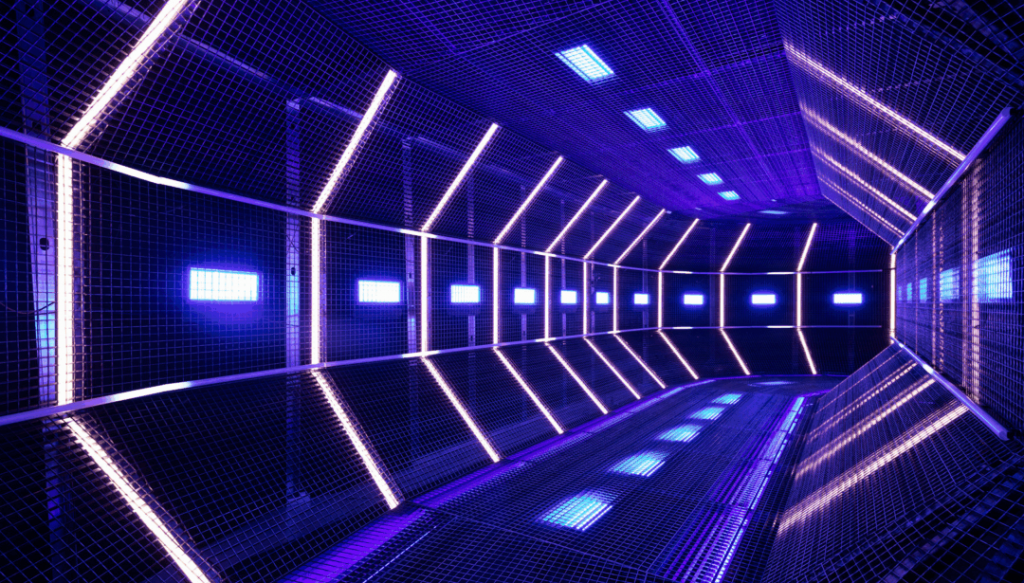 觀眾分別坐在隧道內(nèi)部兩側(cè),地板和曲面墻壁以及天花板全部被LED顯示屏包裹,配合著變幻莫測(cè)的視頻圖像,使人們仿佛置身于一個(gè)夢(mèng)幻的科幻世界。