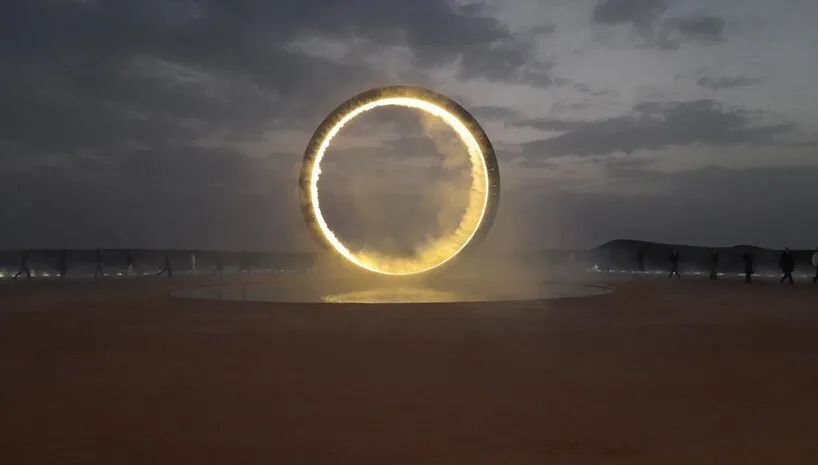 演出即將接近尾聲時(shí),一個(gè)史詩般巨型的光圈在其內(nèi)部邊緣被照亮——從沙漠中的圓形水潭中緩緩升起、旋轉(zhuǎn)并散發(fā)出霧氣,電子鼓點(diǎn)聲和悠揚(yáng)的古典音樂交織其間。