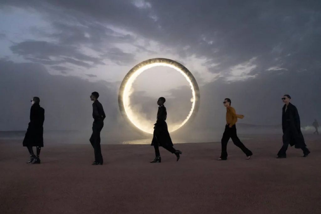 Saint Laurent 2023 春夏男裝秀 ,在距離馬拉喀什近20英里的Agafay 沙漠舉辦,聯(lián)合英國藝術(shù)家 Es Devlin 合作在摩洛哥沙漠里,打造了一個(gè)由發(fā)光的石碑環(huán)裝置組成的秀場。