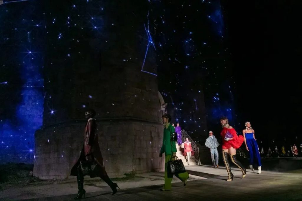 創(chuàng)作總監(jiān)Alessandro Michele將其作為主題,用他一貫擅長的極繁美學(xué),通過創(chuàng)意投影、燈光藝術(shù)重塑宇宙星河在城堡上空盤旋,帶來一場以時(shí)裝、文學(xué)、藝術(shù)、宗教、符號(hào)等相聯(lián)結(jié)的時(shí)裝秀。