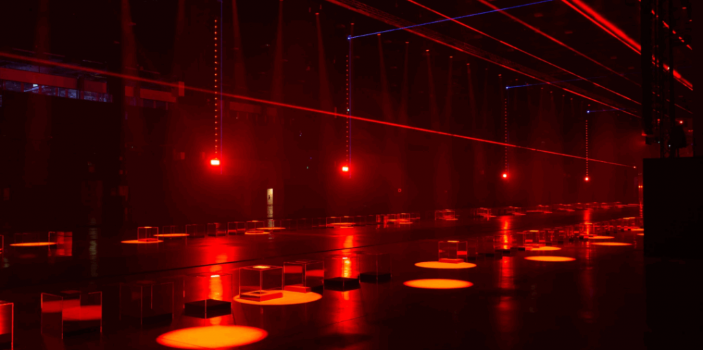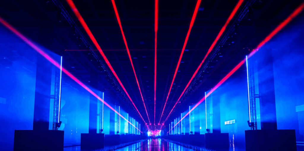 法拉利作為運(yùn)動(dòng)、速度的代名詞,秀場布景也呈現(xiàn)出利落、動(dòng)感的氛圍,全場幾乎被動(dòng)感燈光包裹,以品牌標(biāo)志性燈光顏色開場,走秀展示伴隨著激烈的燈光節(jié)奏進(jìn)行,充分貫徹法拉利的品牌風(fēng)格。