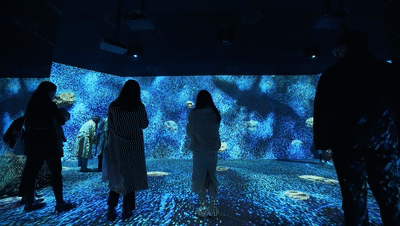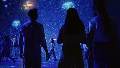 影片巧妙融合了現場的全息投影傳感裝置,參觀者腳下的足跡,將帶動光點變換,劃出一道道如河流般的軌跡,當磅礡的音樂聲響起,腳下的光點與屏幕上的星空呼應,接下來從天而降的熒光水母,又巧妙將場景帶入了海洋之中。