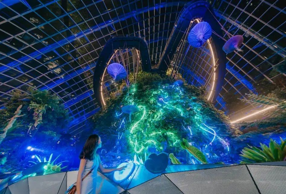 高35米的「云山」,變成像奧蘭多迪士尼《阿凡達世界》還原的懸浮山,通過設計與巧思,呼應電影中經典的畫面:粉色水母狀的Panopyra,懸掛于眼前。伸出手來,敲擊前方地衣狀的植物,隨著多次拍打,還能觸發熒光脈動。