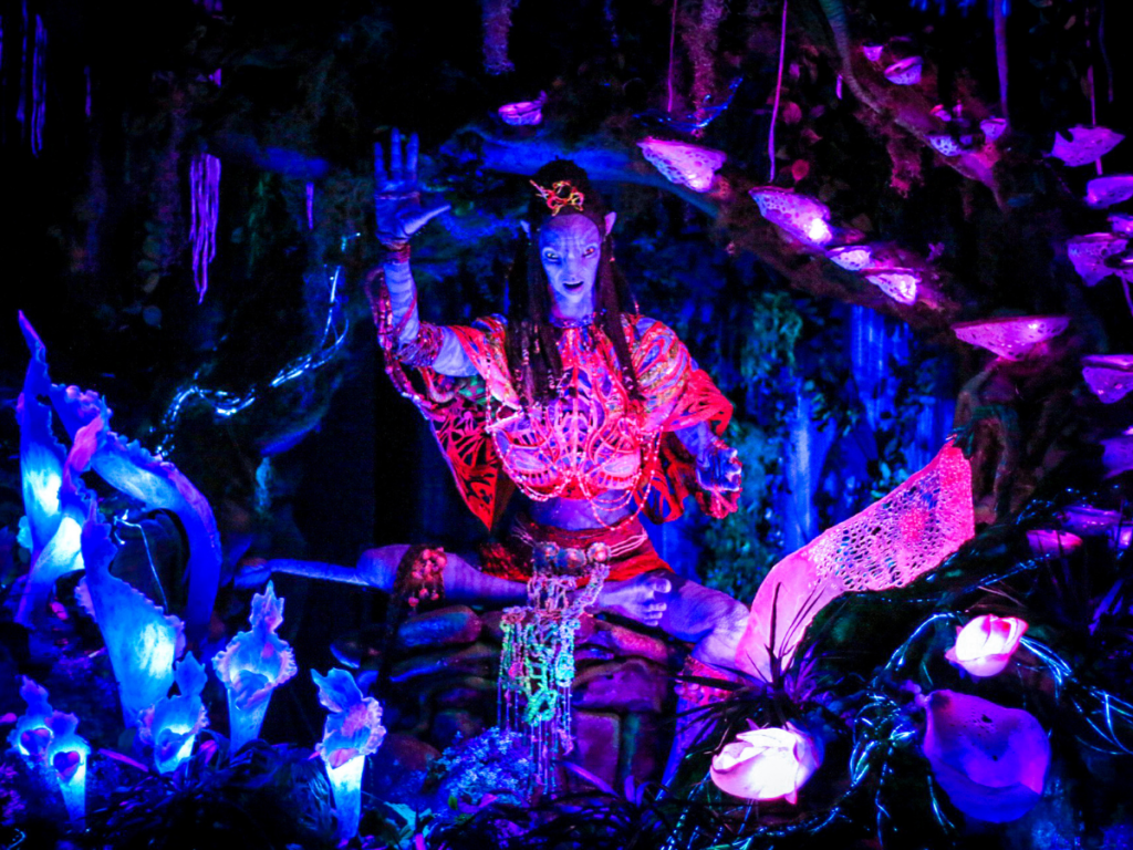 游客們可以乘著獨木舟隨波漂流,途經潘多拉星球的奇幻森林,漂浮的水母生物在半空中飛舞,光如跳動的精靈,垂下的藤蔓有光的加入變得栩栩如生,各種肉食動物在遠處小跑,與神秘的外星人互動……