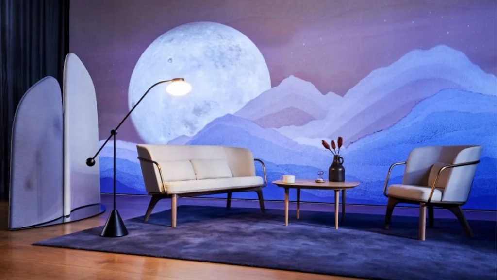 進入展區(qū),游客們首先會進入一個休息室,休息室的背景是平靜的風景壁畫,一輪滿月漂浮在涼爽的山脈后。