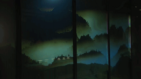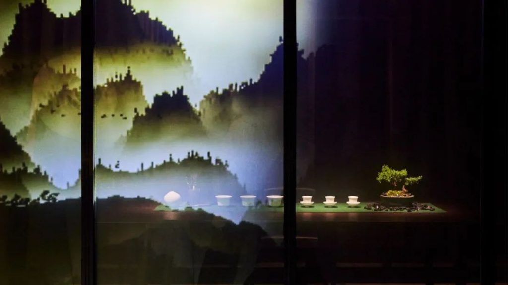 水墨形式的靈感來自亞洲的茶文化傳統(tǒng),當游客在這個空間內(nèi)移動時,交互式屏幕會對游客動作做出反應,朦朧煙霧慢慢消散,遠處的山景逐漸顯現(xiàn)。