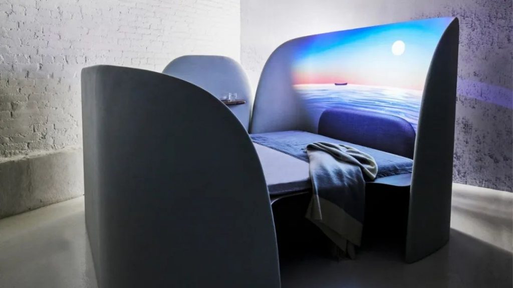 投射在床尾的影像從大自然中汲取靈感,平緩的丘陵,綿延的峻嶺,以及無波的湖水……環(huán)繞式音箱播放的自然之聲,像繭一樣包裹著游客,游客能從心感受重擔從肩頭卸下的輕松感,達到身心健康的療愈。
