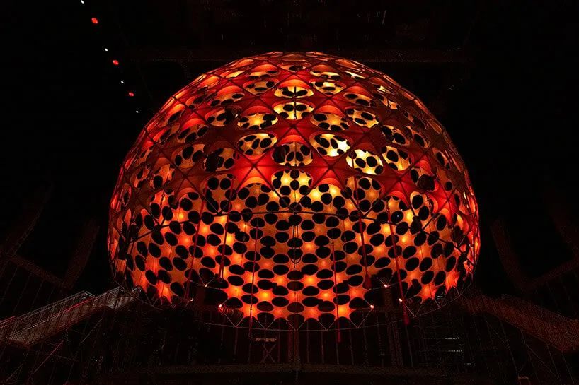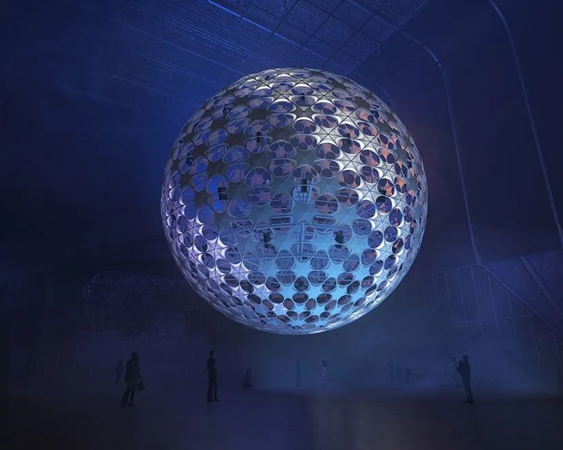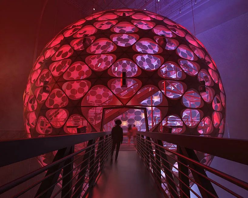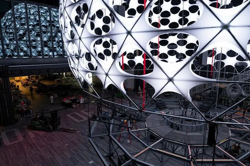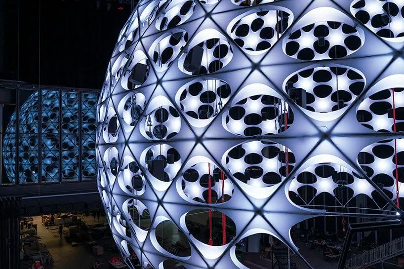 在球體內(nèi)部,250名觀眾將聚集在特別設計的聆聽平臺上,該平臺高出地面34 英尺,圍繞著中央網(wǎng)絡。“空間化音景”由一百多個揚聲器組成,這些揚聲器將聲音在人們的身體上方、下方穿過和移動,球體表面的動態(tài)照明讓這場超真實的多感官之旅更加動感、炫酷。