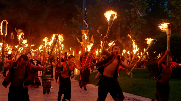 帥氣靚麗的少數民族姑娘小伙身著盛裝的少數民族,揮舞著燃燒的火把,形成一條壯觀的“火龍”,迎接賓客來共度節日盛會,火光與歡呼聲匯成一片,一起加入這場令人陶醉的狂歡盛宴!