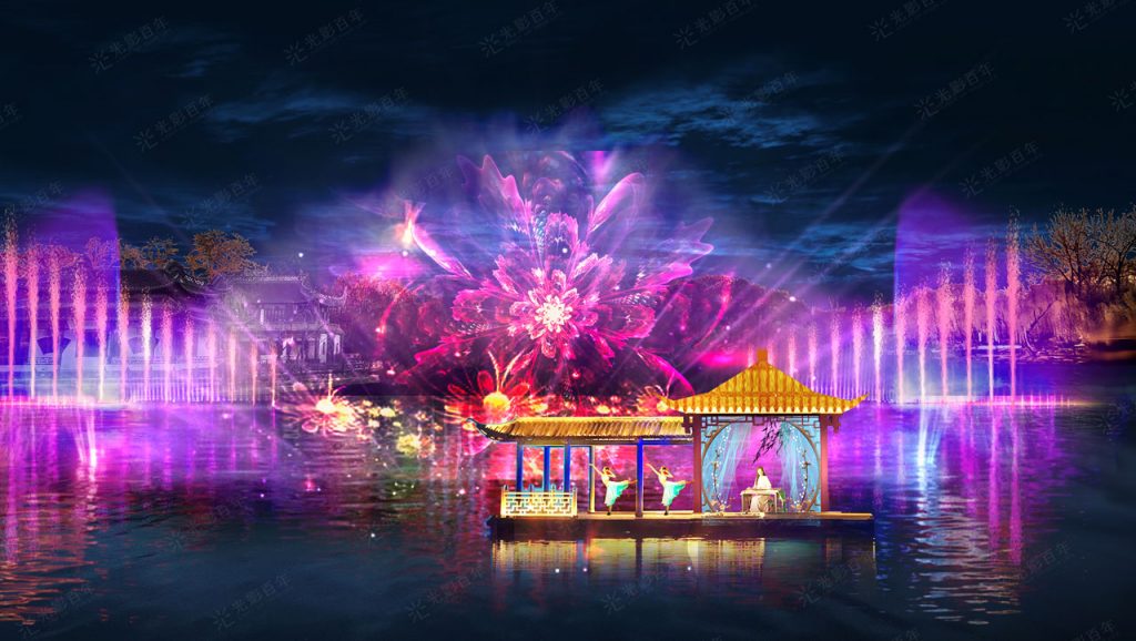 水幕全息秀:結(jié)合水幕投影技術(shù),在景區(qū)水體中營造“浮空”演出空間,常用于壓軸大秀。