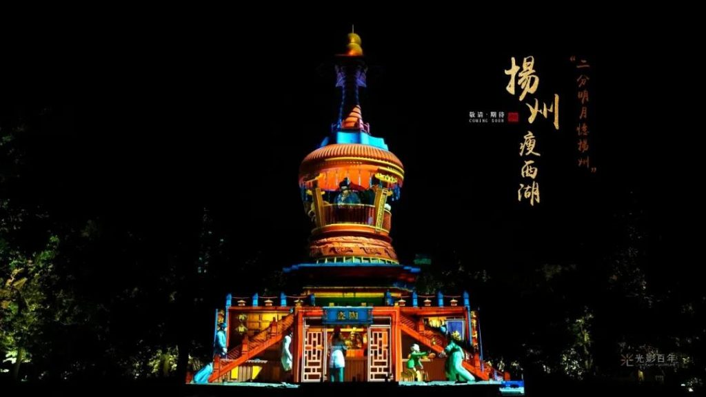 《二分明月憶揚州》夜游項目由國際級數字創意團隊及揚州文化權威教授專家,歷時2年匠心打磨,從傳播揚州在地特色文化、全方位提升游客體驗感出發。以美輪美奐的瘦西湖為載體,唐詩韻味為靈魂,創意科技應用加持賦能,展開“天下三分明月夜,二分無賴是揚州”的煙云畫卷。