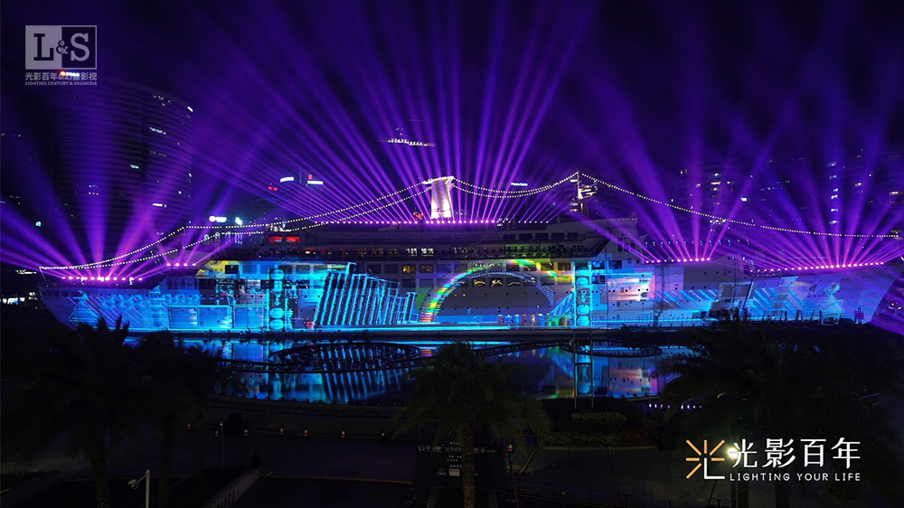 國內首創170米超大型輪船體3DMapping燈光光影秀—《未來之光》,由光影百年作為此次作品的總策劃團隊成功打造呈現。通過各種新型燈光技術,實現燈光場景化,作品包含極其魔幻的燈光前秀、激光秀及震撼無比的3D MAPPING光影秀。